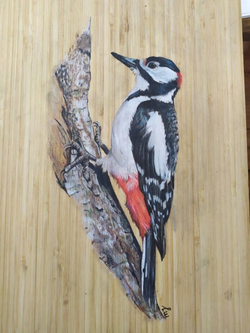 Deze plank is met de hand getekend met kleurpotloden direct op bamboe en afgelakt.